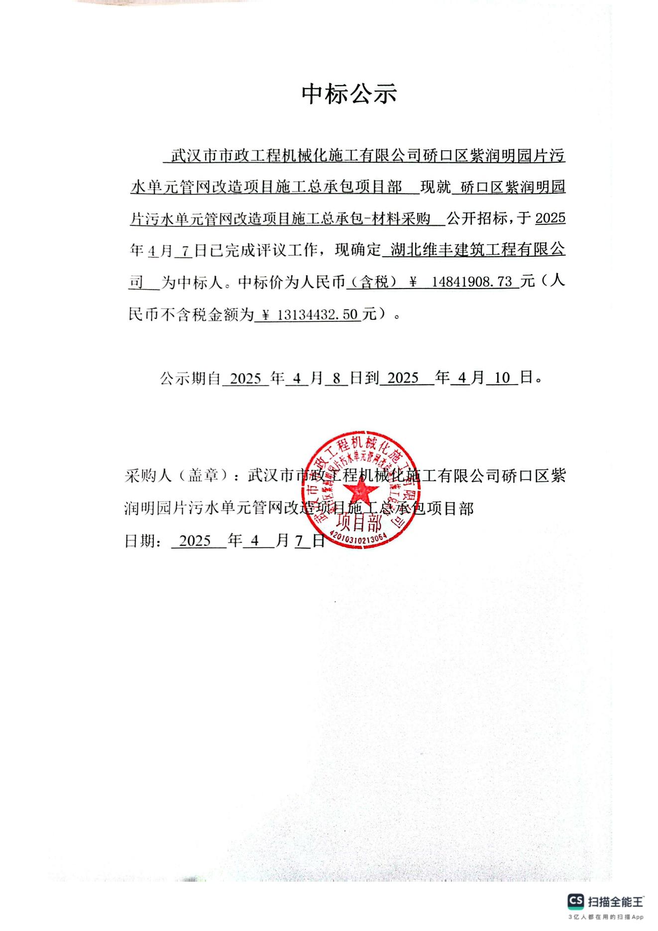 硚口區紫潤明園片污水單元管網改造項目施工總承包-材料采購中標公示