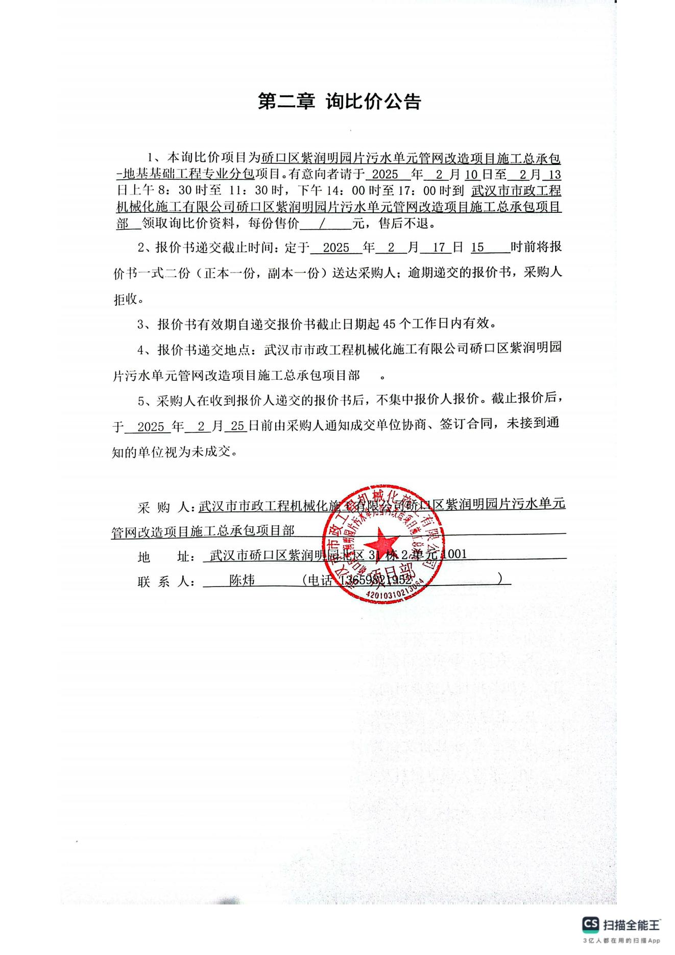 硚口區紫潤明園片污水單元管網改造項目施工總承包-地基基礎工程專業分包詢價公告