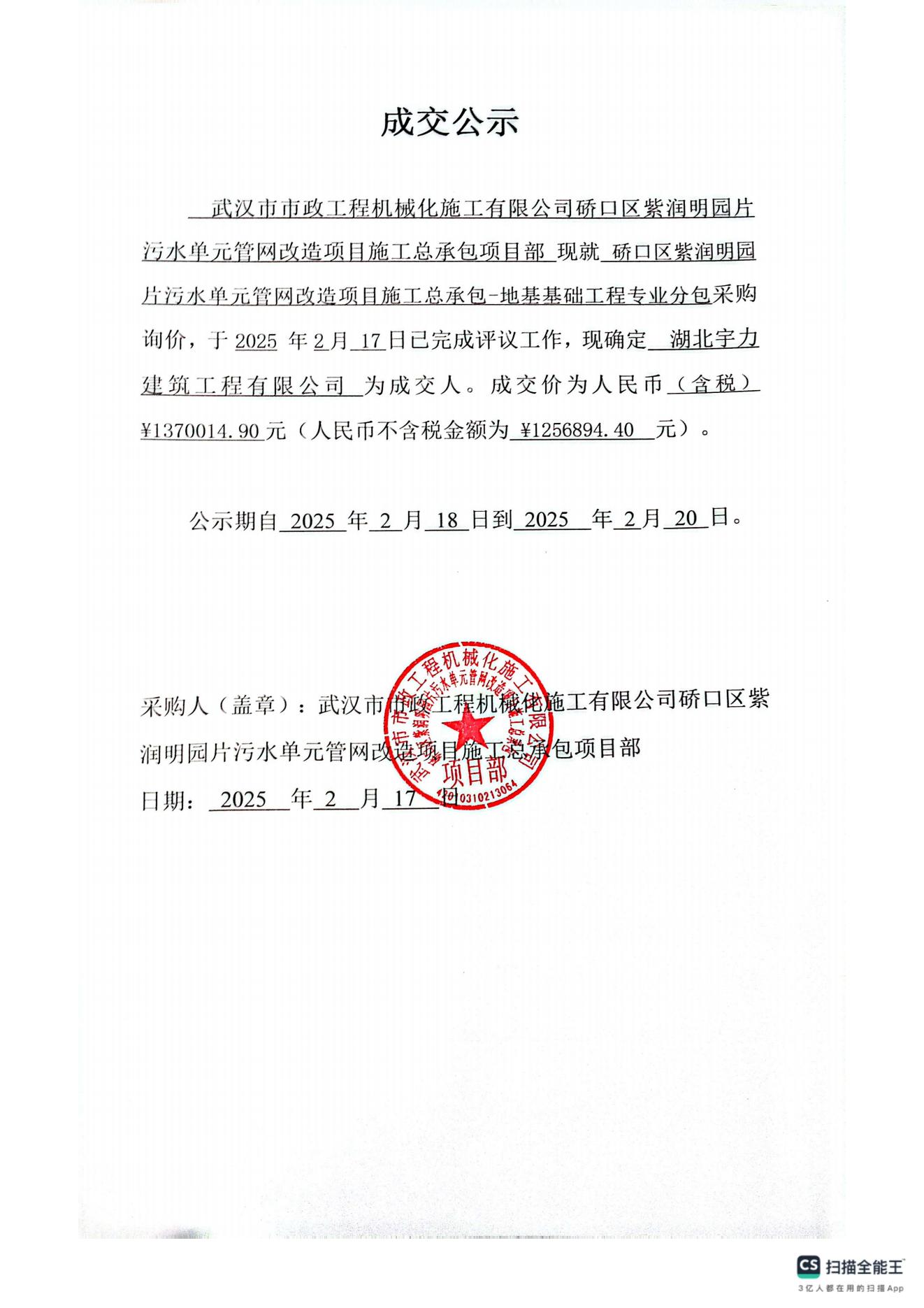 硚口區紫潤明園片污水單元管網改造項目施工總承包-地基基礎工程專業分包成交公示