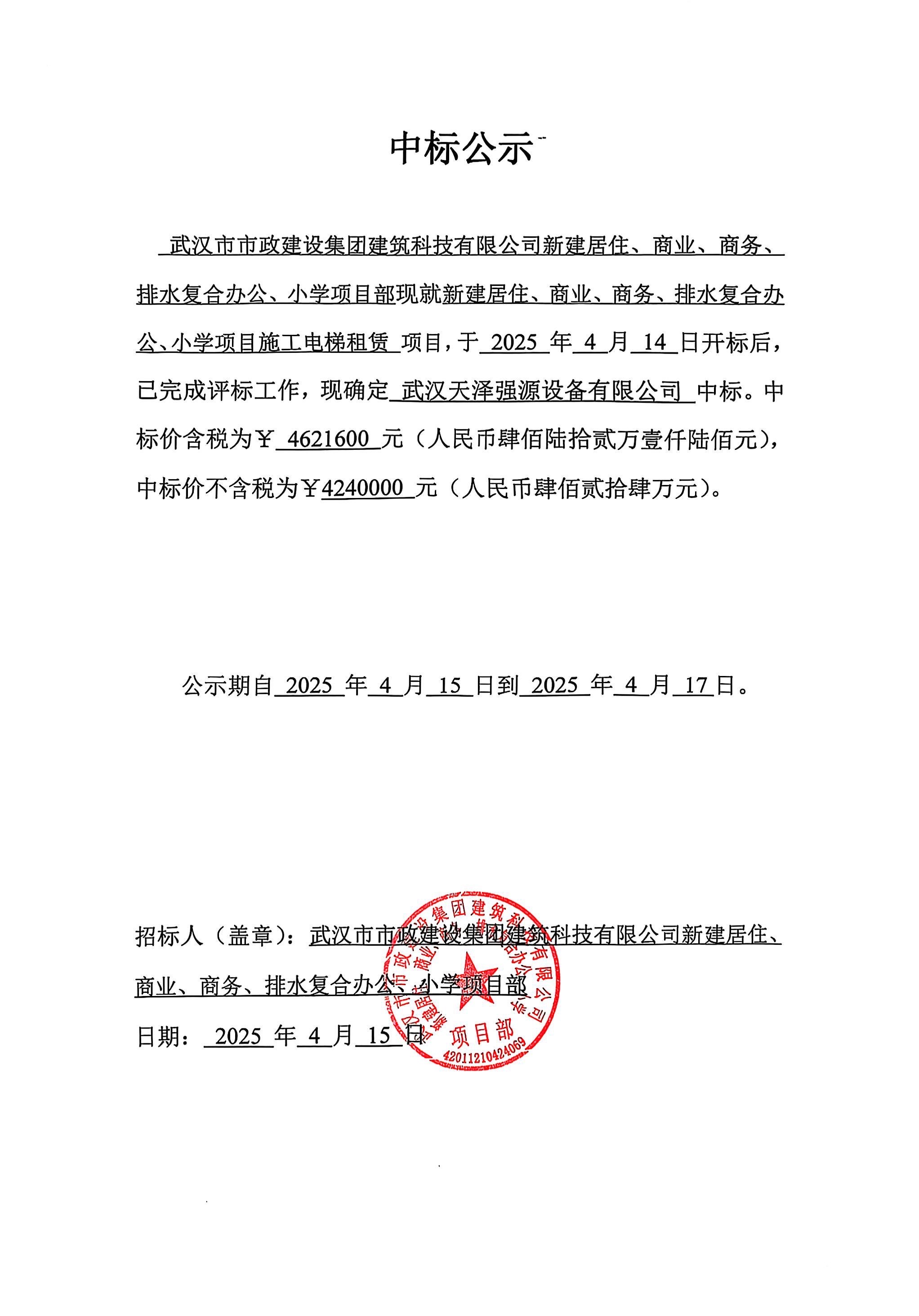 武漢市市政建設集團建筑科技有限公司新建居住、商業、商務、排水復合辦公、小學項目施工電梯租賃中標公示