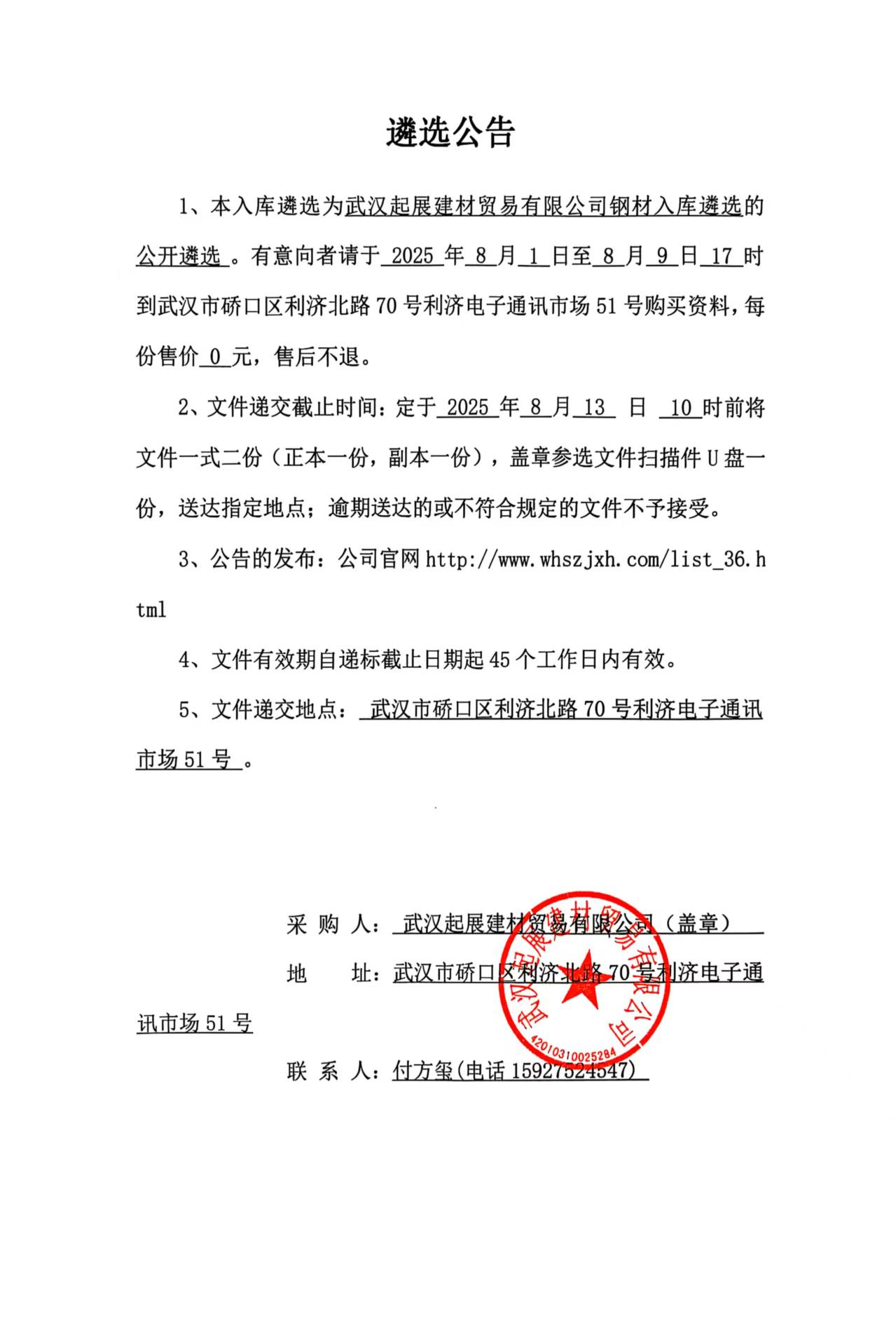 武漢起展建材貿易有限公司鋼材供方入庫遴選公告