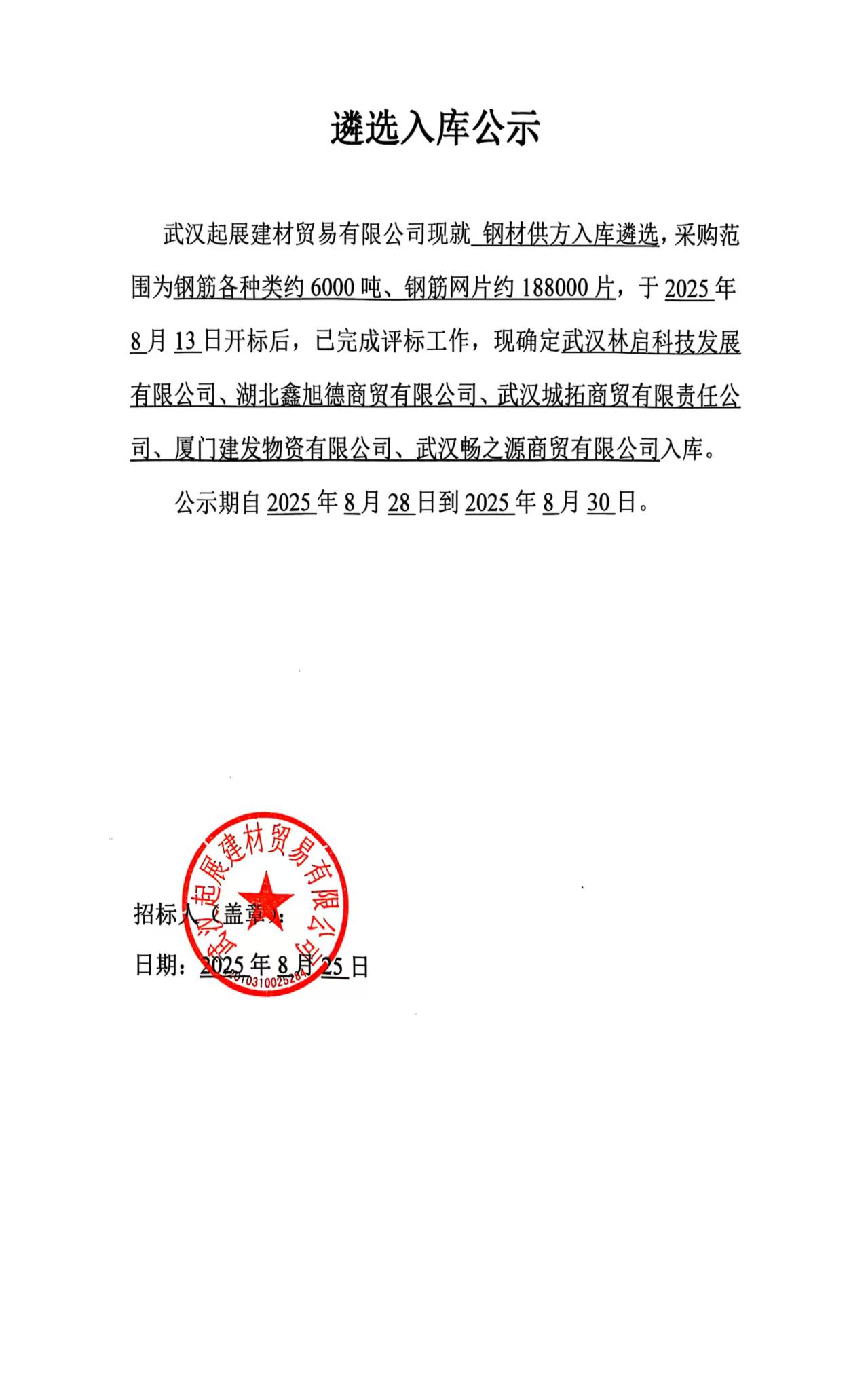 武漢起展建材貿易有限公司鋼材供方遴選入庫公示