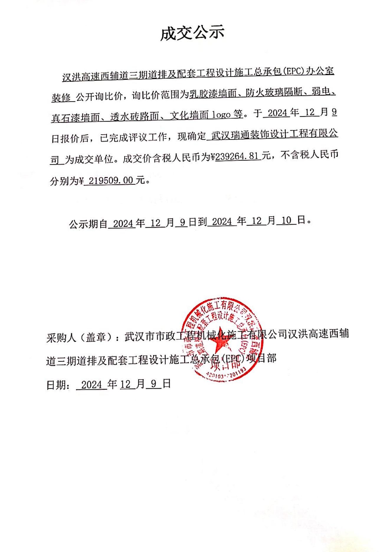 漢洪高速西輔道三期道排及配套工程設計施工總承包(EPC)辦公室裝修成交公示